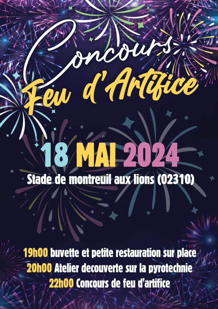 22h00 – Assister à l’apogée de la soirée avec le tir de 5 feux par nos concurrents ! Admirez les éclats de lumière et les couleurs éblouissantes qui illuminent le ciel de Montreuil-aux-Lions. Chaque feu est une œuvre d’art unique, créée avec passion et expertise.